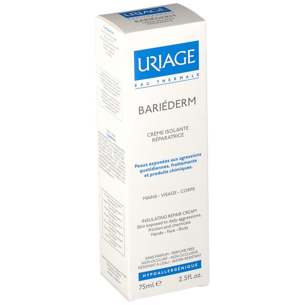 Uriage Bariéderm Cica Crème Isolante Réparatrice 75 ml est une crème destinée à la fois aux adultes, aux enfants et aux bébés. Sa formule permet d’agir sur différents domaines grâce au complexe breveté Poly-2P qu’elle contient. Elle isole ainsi l’épiderme en surface sans effet occlusif tout en favorisant sa réparation. Aussi, le squalane et les stérols végétaux, associés à l’Eau Thermale d’Uriage, permettent d’apporter confort et apaisement. De plus, il faut savoir que sa texture invisible laisse un film protecteur et non gras après l’application. Plus important encore, la crème est résistante à l’eau. Il est également à noter qu’il s’agit d’un produit sans parfum. C’est aussi une crème hypoallergénique qui a été fabriquée en France par le laboratoire Uriage.